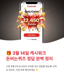 화이트데이이자 즐거운 주말의 시작인 3월 14일 토요일! 오늘 캐시워크 돈버는퀴즈에는 유용하고 달콤한 퀴즈들이 쏟아졌습니다.