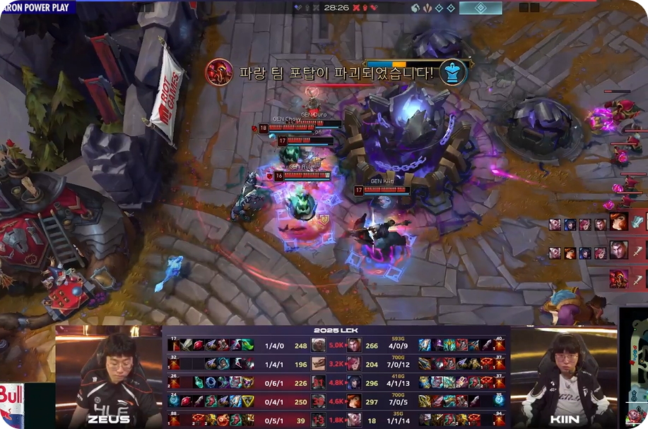 - **젠지의 반격**: 하지만 공허 유충 교전에서 젠지가 반격에 성공하며 흐름을 되찾았습니다. 특히 미드라이너 ‘쵸비’ 정지훈의 **아지르 궁극기**가 상대 진영 중심을 강타하며 3킬을 기록, 글로벌 골드 차이를 역전시켰습니다.